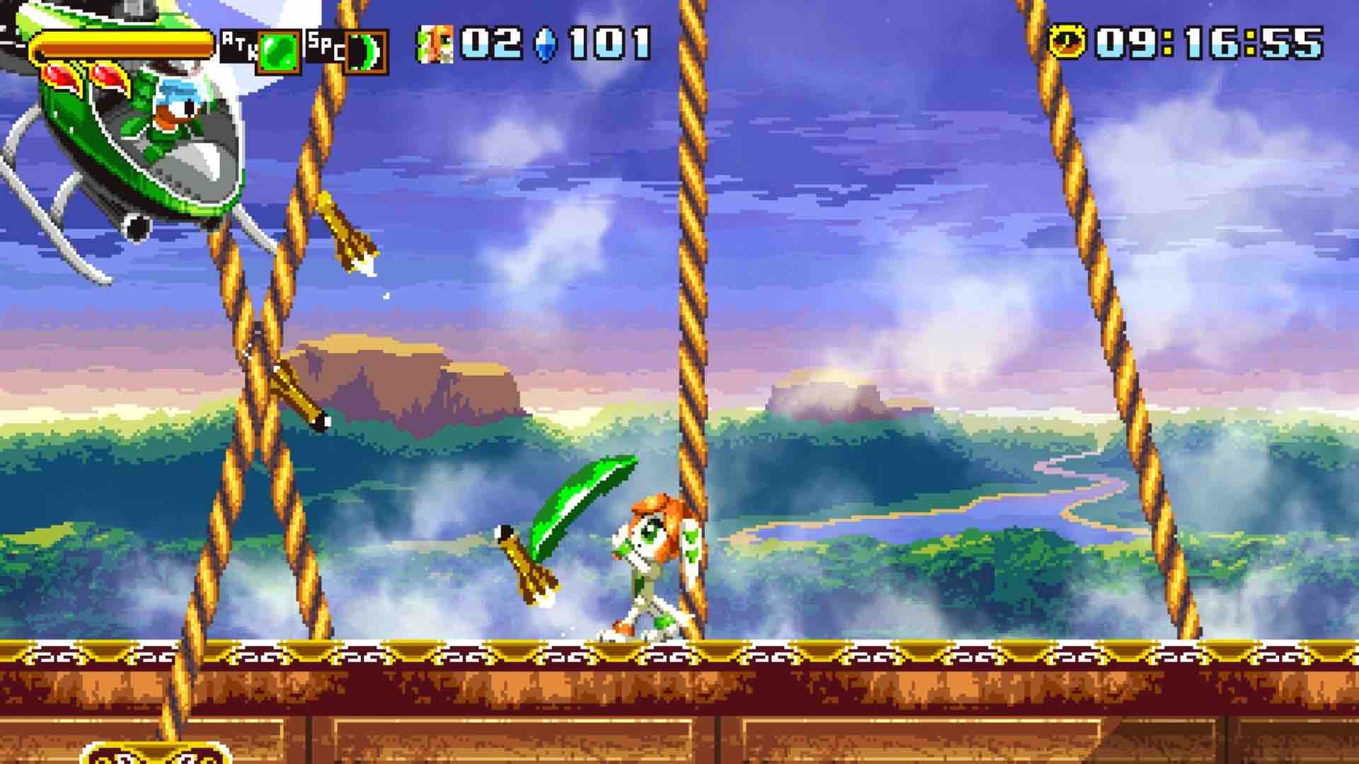 Carol the cat feels a little closer to home with fans in how you can curl up into a ball if you can gain enough momentum. Pressing the jump button while airborne will send Carol gliding like Knuckles until you can find a wall to latch on to. Her motorbike, collected as a unique power-up, changes her moveset slightly by allowing you to spin attack instead of glide with navigational skills that will put a Trials rider to shame. Lilac, on the other hand, is the speedier of the two on foot who possesses a horizontal slice attack during her second jump. Her meter-draining special ability lets you blast across the screen with a burst of energy – a handy tool to keep the pace going while sending enemies in her path into oblivion.