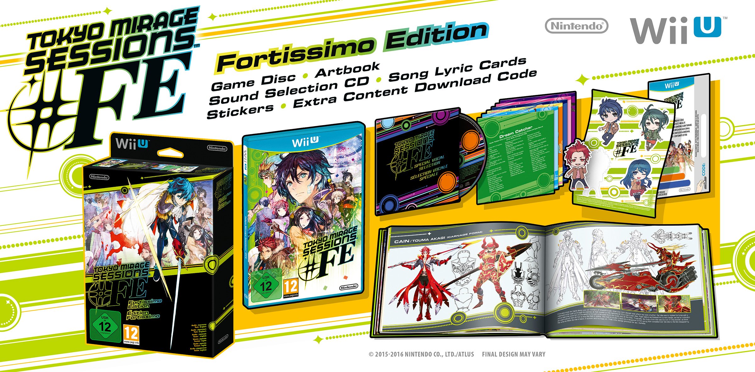 Its contents are the same in both regions, containing a physical copy of Tokyo Mirage Sessions #FE, a 5×8 colour artbook, a soundtrack CD with six tracks from the Wii U exclusive, six song cards and a sticker sheet, and will be priced at $79.99.